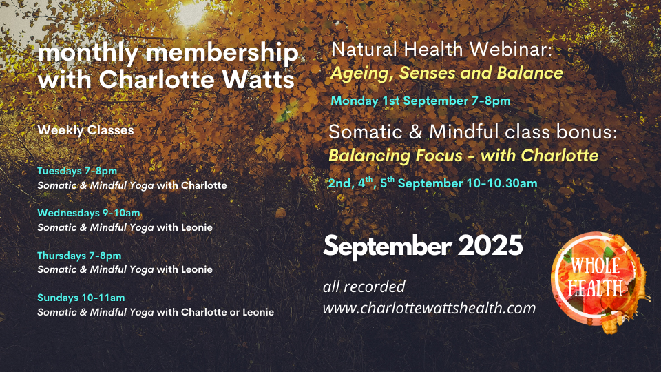 • Charlotte's monthly health webinars (and archive) with nutrition, lifestyle, moving and breathing information and advice for a variety of health topics – over 50 previous topics in the library